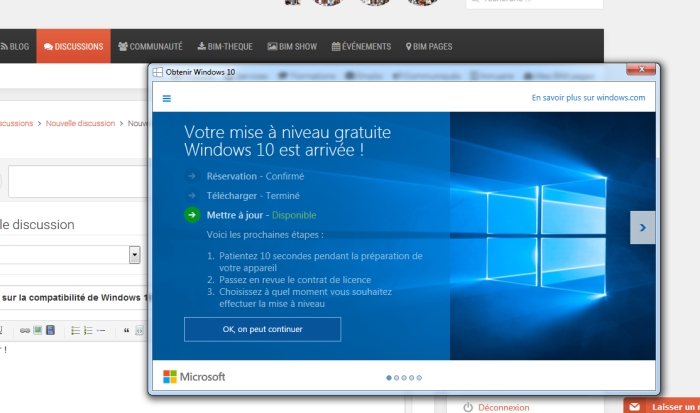 Normalement le script de pré-installation vérifie la compatibilité avant d'annoncer la démarche, avez-vous mis à jour votre windows vers la v10 ? des problèmes à signaler ?