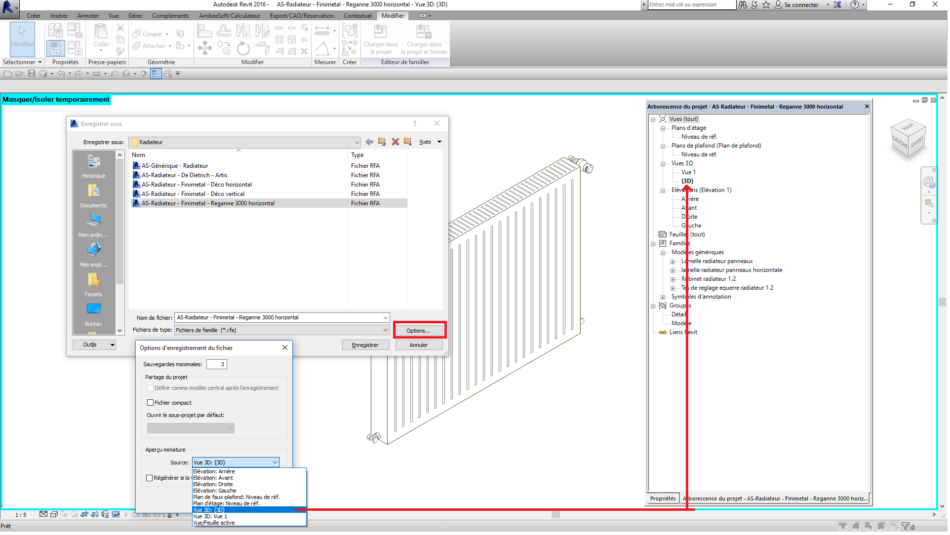 Ouverture de la famille. affichage de la vue 3D nommée "vue 1" je place ma vue de façon à voir l'avant de ma prise