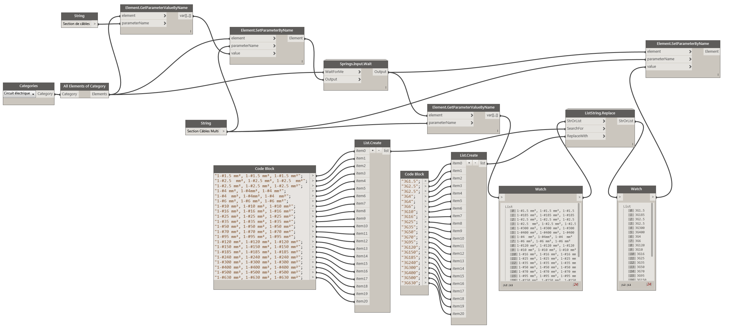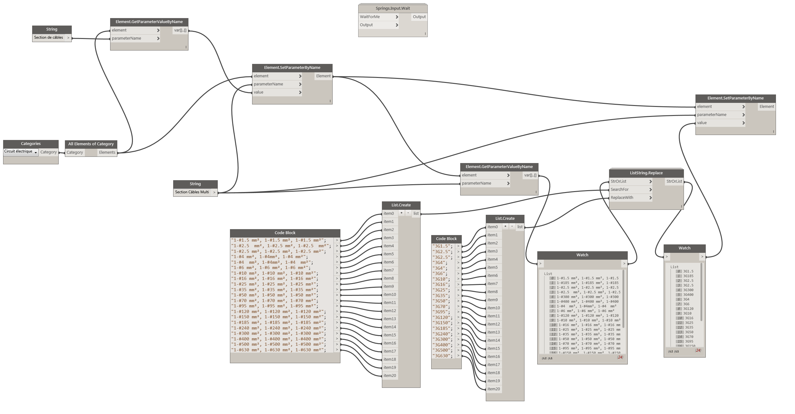 Comme demandé, je publie ici ma méthode pour afficher les sections de câbles électriques en multifilaire (« 3G2,5 » au lieu de « 1-#2,5 mm², 1-#2,5 mm², 1-#2,5 mm² ») à l’aide de Dynamo :