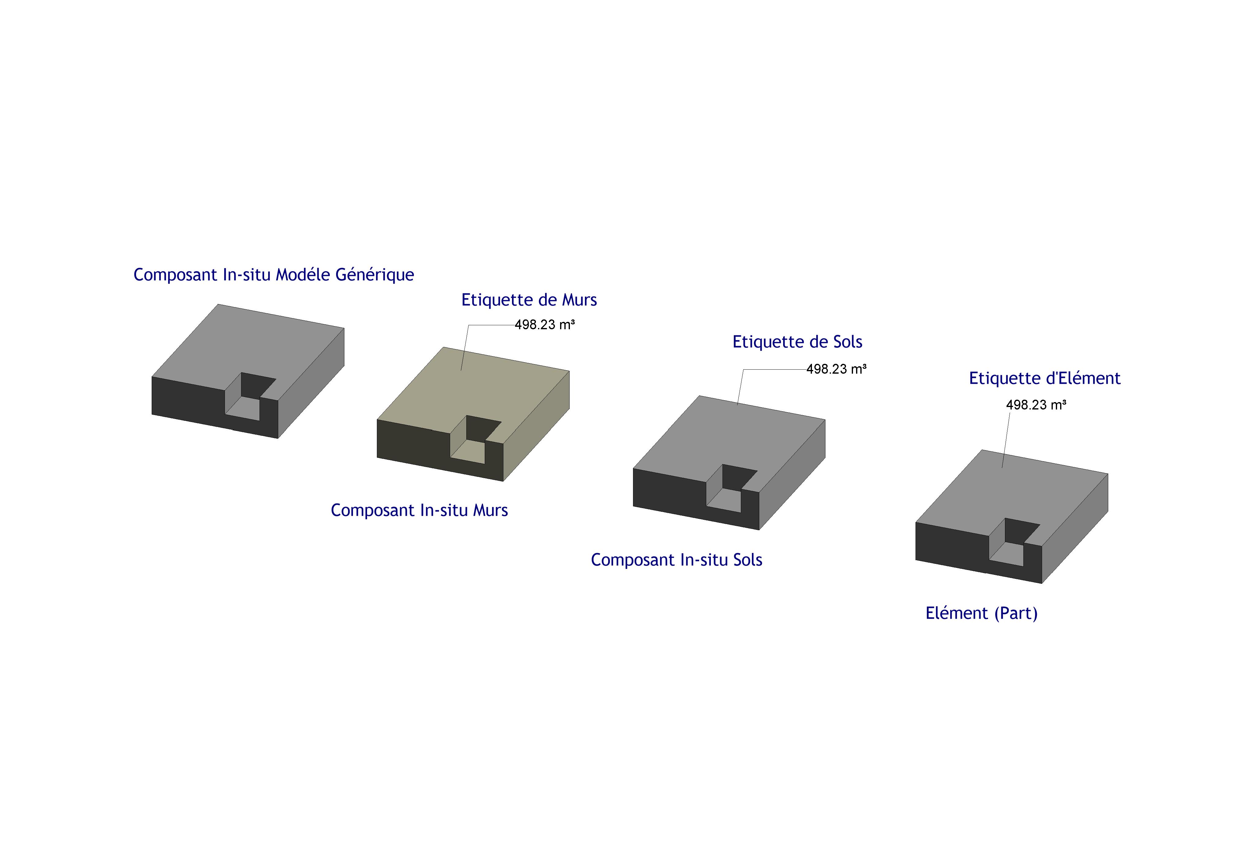 La méthode consiste à changer la catégorie de tes composants in-situ, par exemple en Sols ou Murs, et de créer l'étiquette associée (de type Murs ou Sols ) reprenant le volume.