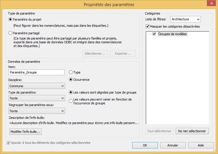 Il n'est pas possible d'ajouter des paramètres aux groupes.