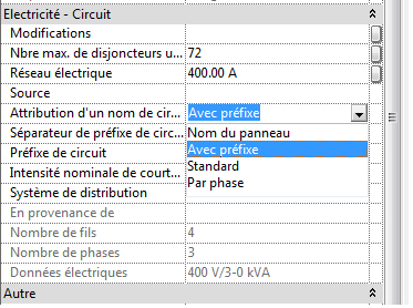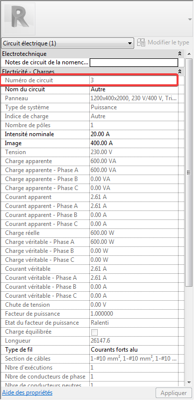 Mais je ne peux pas parce que dans ma fenêtre de propriété, « Numéro de circuit » est grisé. Idem, je ne peux pas forcer depuis la nomenclature des tableaux.