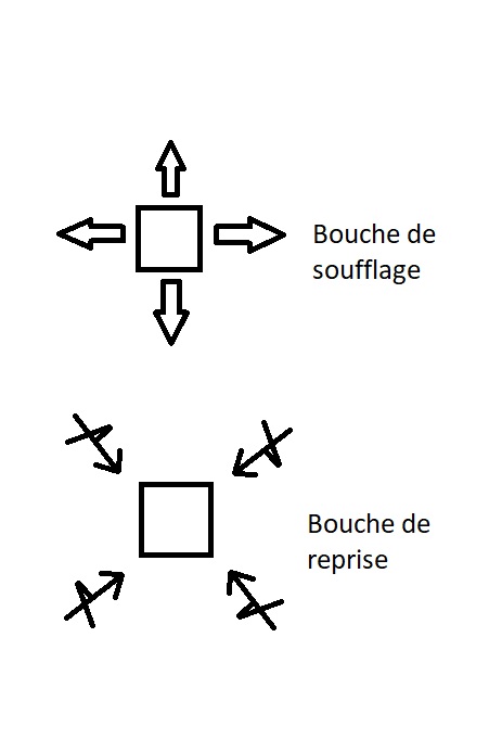 Soufflage, reprise, extraction et rejet... j'ai en tout quatre bouches différentes rectangulaire et autant circulaire la différence se situant sur les flèches notamment.