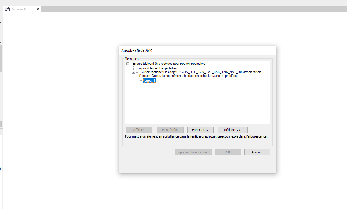 Et en ouvrant la maquette All (global avec tous les lots liés) sur REVIT 2019, une erreur se produit indiquant qu'il lui est impossible de lié le modèle CVC (voir PJ).