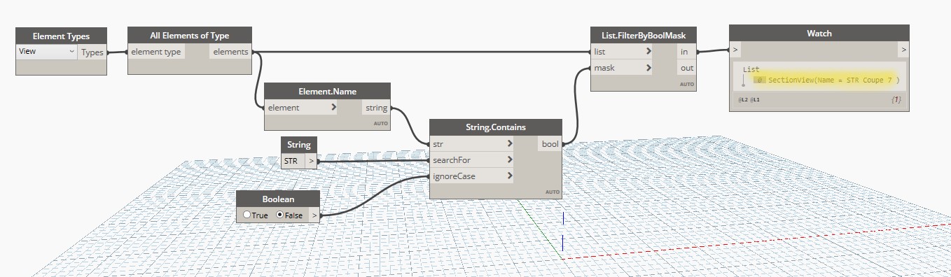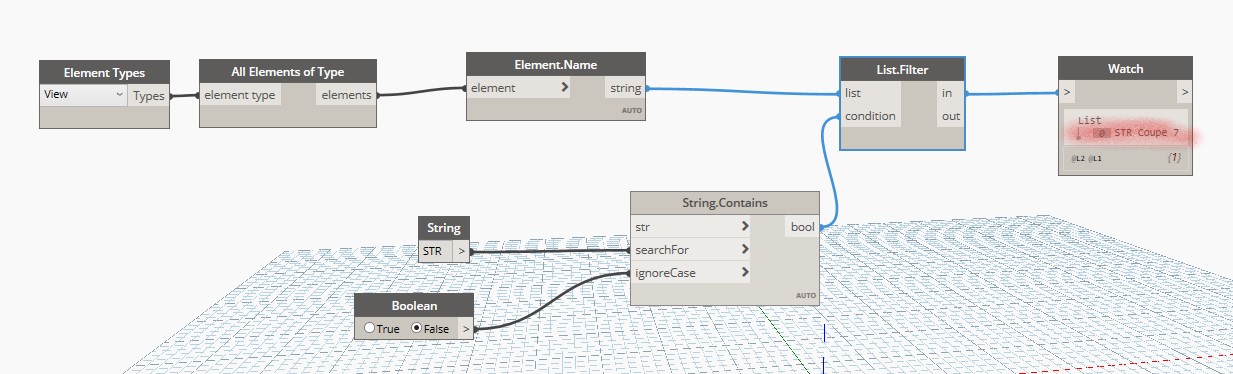 mais j'ai fait un test sous dynamo 1.3.4 et dynamo 2.10.1, et le probleme avec le list.filter viendrait du fait que le string.contain ne semble pas apprécier d'avoir le element.name en mode fonction juste devant lui.
