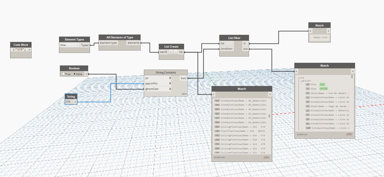 je souhaite effectuer une sélection de plusieurs niveaux pour ensuite les ajouter à des feuilles via dynamo. pour se faire j'ai d'abord créé une liste de toutes les vues et je souhaite filtrer cette liste de manière à ce que uniquement les vue dont le nom contient le suffixe "STR" soit affichée dans la liste malheureusement le filtre ne s'applique pas et j'ai du mal à comprendre pourquoi. merci de bien vouloir éclairer ma lanterne