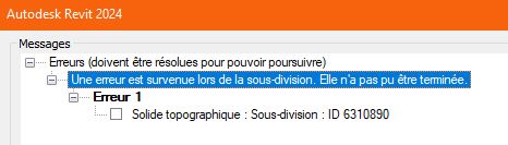 Passé récemment sous revit 2024, je rencontre énormément de problème pour sous-diviser un solide géographique, un message d'erreur suivant " une erreur est survenue lors de la sous-division. Elle n'a pas pu être terminée" apparaît presque systématiquement une fois mon contour réalisé...Avez-vous des suggestions SVP car c'est ingérable en l'état?
