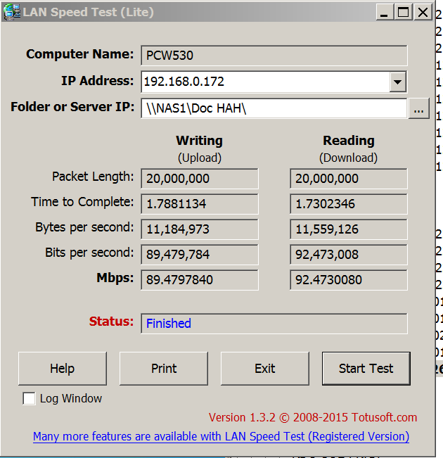 avec par exemple "LAN Speed Test " version LITE gratuite-sur chaque postes, : exemple sur mon poste vers un répertoire du serveur -voir PJ-suivant les unités utilisées pour le débit tu pourra comparer,chez moi lors de cet essai c'est indiqué 89 Mbps càd que le débit théorique de connexion est base100 et que mon débit réel est de 89.