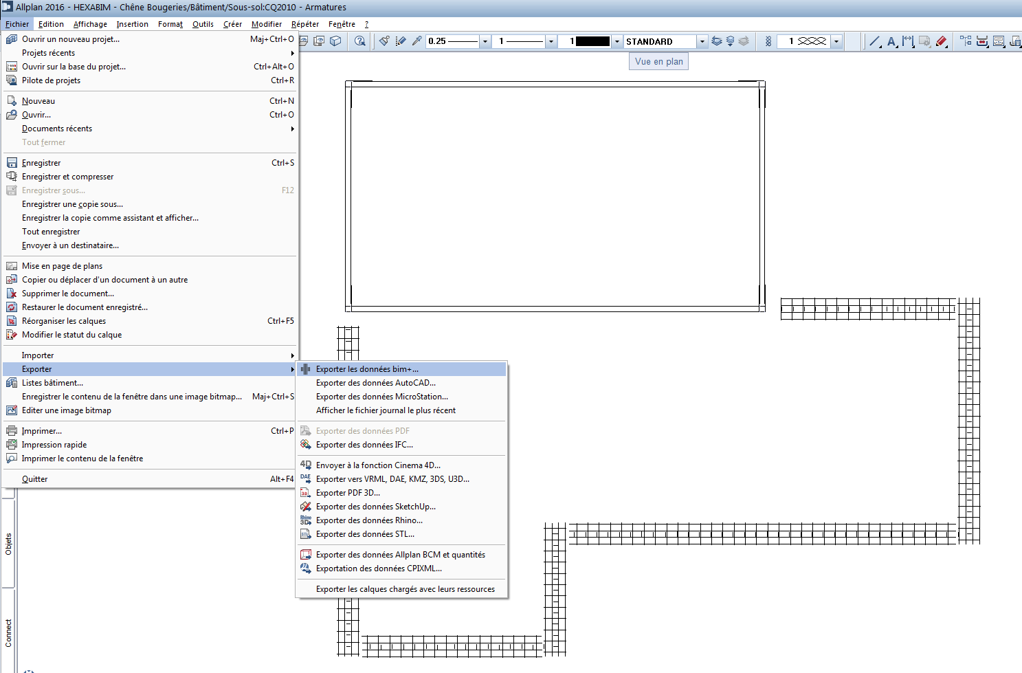 Je me suis basé sur la maquette STR-BETON et j'ai mis en place quelques éléments d'armatures dans les fondations et les voiles du sous-sol.