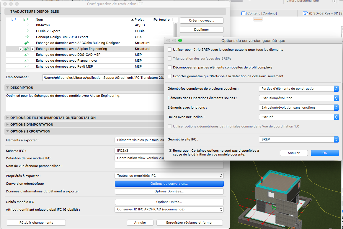 Benoît VAYSSIERES : Le traducteur ALLPLAN (par défaut dans ARCHICAD) que j'ai utilisé n'envoie pas la géométrie BREP mais les informations respectants les outils originaux (dalles, murs, etc,,) ainsi que toutes les informations pour les extrusions, les opérations booléennes etc... qui y sont liés (voir image jointe)