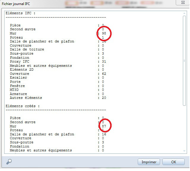 Donc j'ai importé la maquette ARCHI téléchargée depuis l'espace "documents". Comme je l'ai déjà dis dans mon 1er commentaire, j'ai un soucis avec les murs qui sont traduits en élément d'architecture (pièce jointe), je ne vois pas ce que je peux faire avec ceux-ci. C'est ce point que j'aimerais continuer de tester selon les options d'exports.