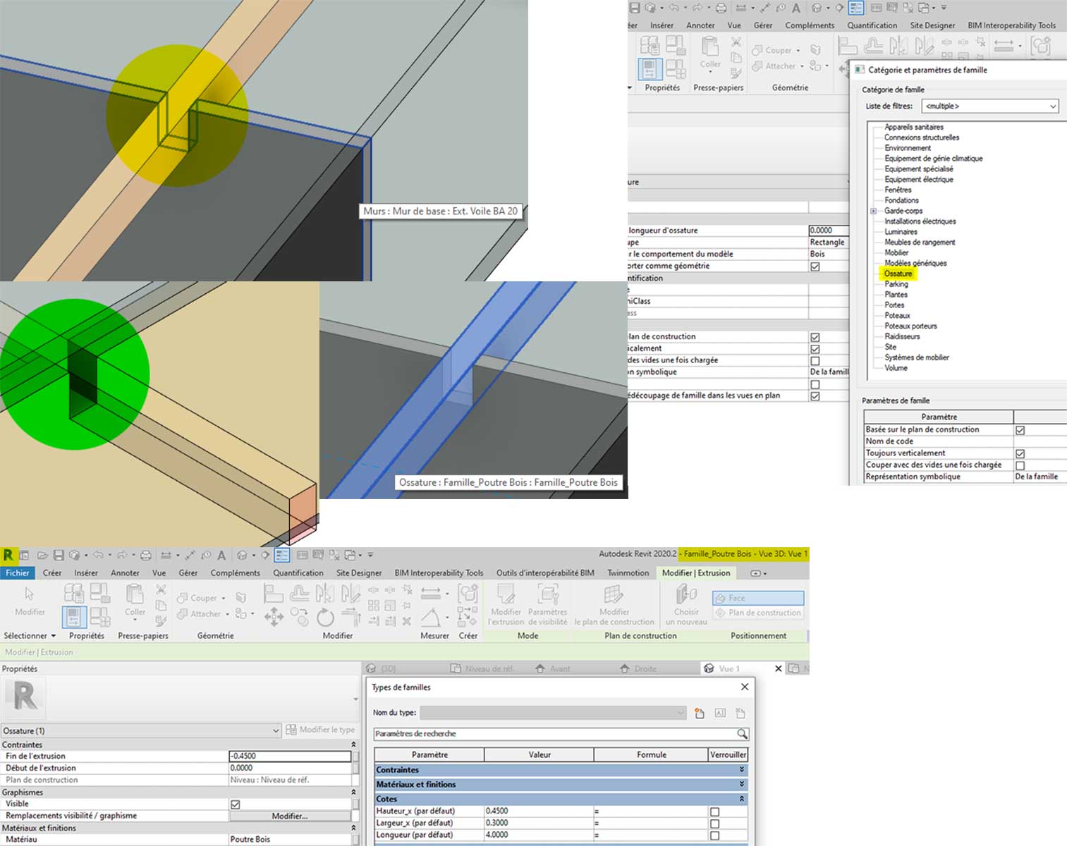 L'avantage d'une famille modèle générique (la requalifier ensuite en ossature, pour les nomenclatures) par rapport à une ouverture: vous avez qu'un seul objet en interaction avec le mur > la poutre crée le trou dans le mur, si la poutre se déplace le trou suit, avec une ouverture c'est une manipulation source d'erreur en cas de charrette > on bouge la poutre, l'ouverture ne suit pas…